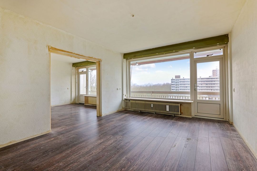 Balkon op het Westen welke bereikbaar is via de woonkamer en eetkamer. De dichte keuken is gelegen aan de kant van de galerij. Deze keuken dient in zijn geheel gerenoveerd te worden.