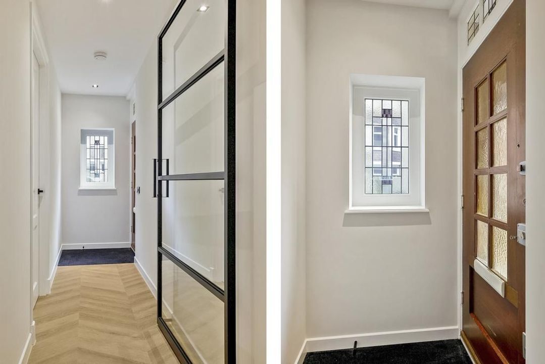 U komt binnen in de ontvangsthal; de hele woning straalt elegantie uit dankzij de moderne PVC-visgraat vloer, het glas in lood bij de entree, de zwarte stalen deuren met glas en de donkerblauwe accenten uit de badkamer en toilet.